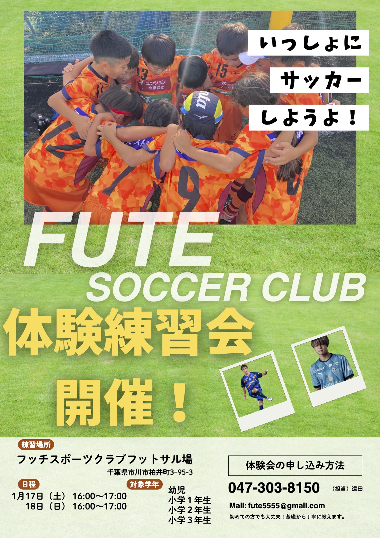幼児〜3年生対象【柏井スクール無料体験会】開催のお知らせ 2026年1月8日 お知らせ この度フッチスポーツクラブでは、幼児〜3年生を対象とした【無料体験スクール】を開催致します。 詳細とお申し込みはこちらからお願いいたします。 URL Copied!