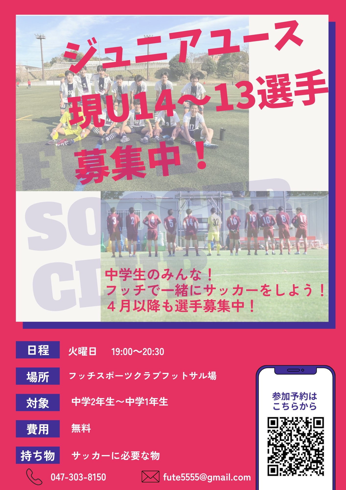 ジュニアユース選手コース募集 2026年3月31日 お知らせ この度フッチスポーツクラブでは、ジュニアユース選手コース募集中です。 詳細とお申し込みはこちらからお願いいたします。 URL Copied!